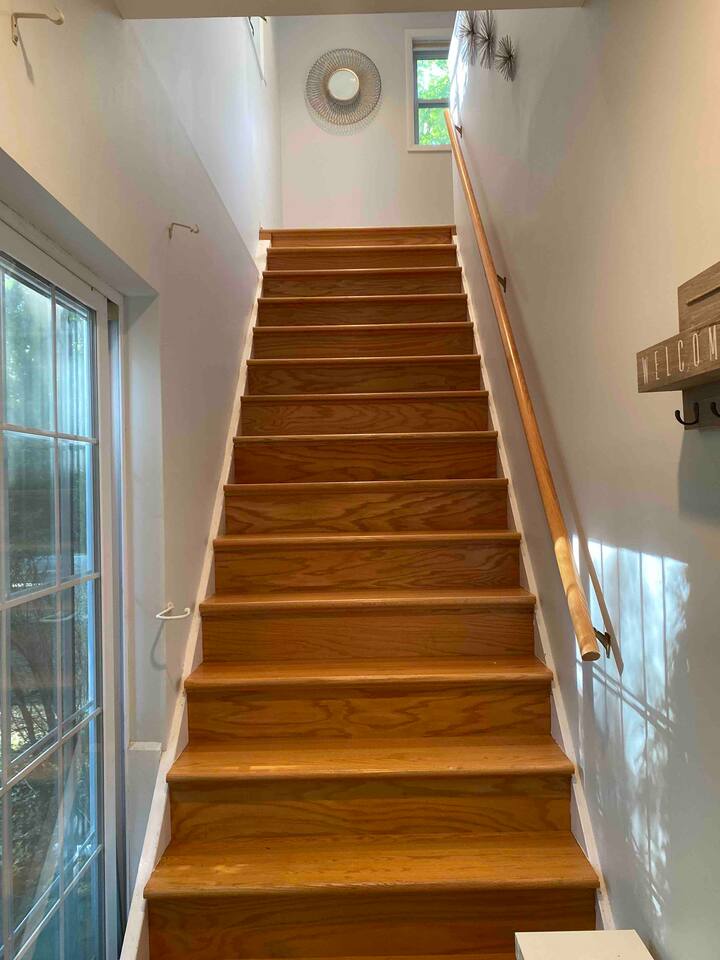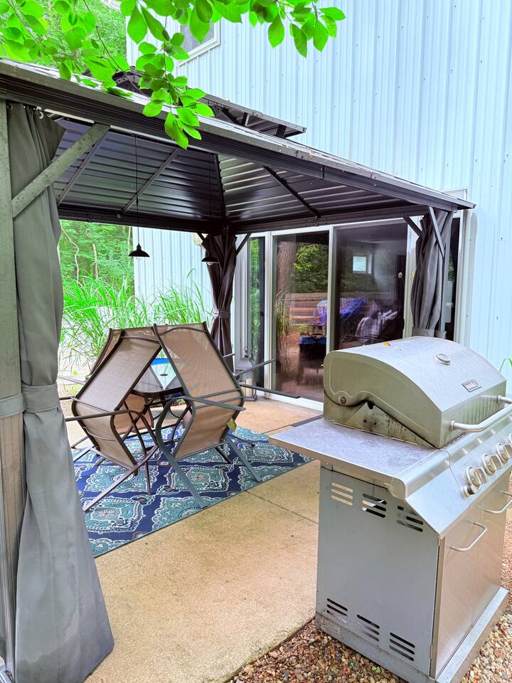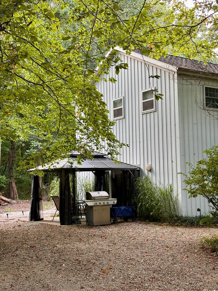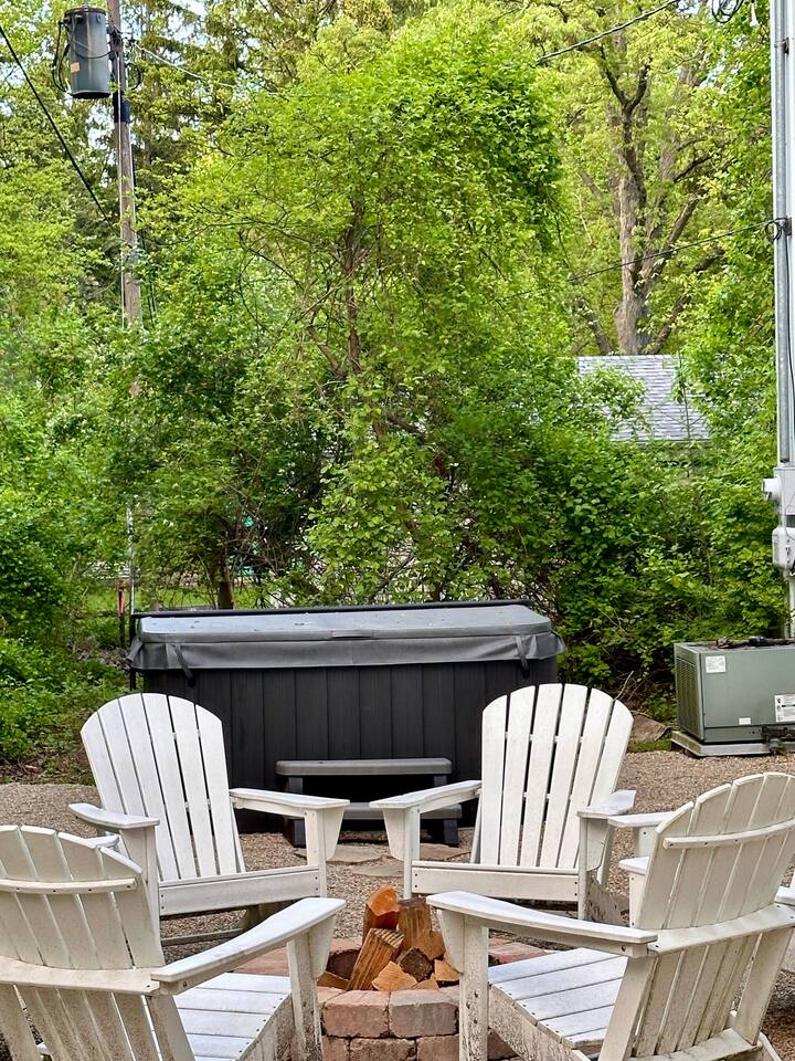 Welcome to our home! Enjoy this converted barn with two separate living and sleeping spaces with a bathroom on each level. Both areas are yours plus YEAR-ROUND outdoor hot tub and tons of other amenities! The lower bedroom suite has a full-size bed, sleeper sofa, kitchenette and a private bathroom w sauna. Upstairs bedroom features a queen bed and bunk beds. All beds boast comfy premium memory foam mattresses and all TVs are 4K smart TVs. The kitchen is modern and well-equipped for cooking meals and downstairs kitchenette is perfect for when you’re all gathered around the fireplace and still want to warm up a snack or store your beverages in a fridge. Enjoy our quiet wooded retreat just a 10 min walk to Cherry beach or ride over on our complimentary cruiser bikes! *Use at your own risk.* During the summer we have the yard professionally treated for mosquitos so you can take advantage of hot tub, patio, fire pit, and gas grill. We also offer a wide assortment of games and equipment for your enjoyment! *Please request specific items in advance of your arrival so that we can make sure they’re available for your use during your stay. We even have a large enclosed space for pets to relieve themselves! (Pets *must be approved in advance*and there is pet fee and maximum of one pet per group). Come see why Harbert has become the favorite destination in Southwest Michigan!