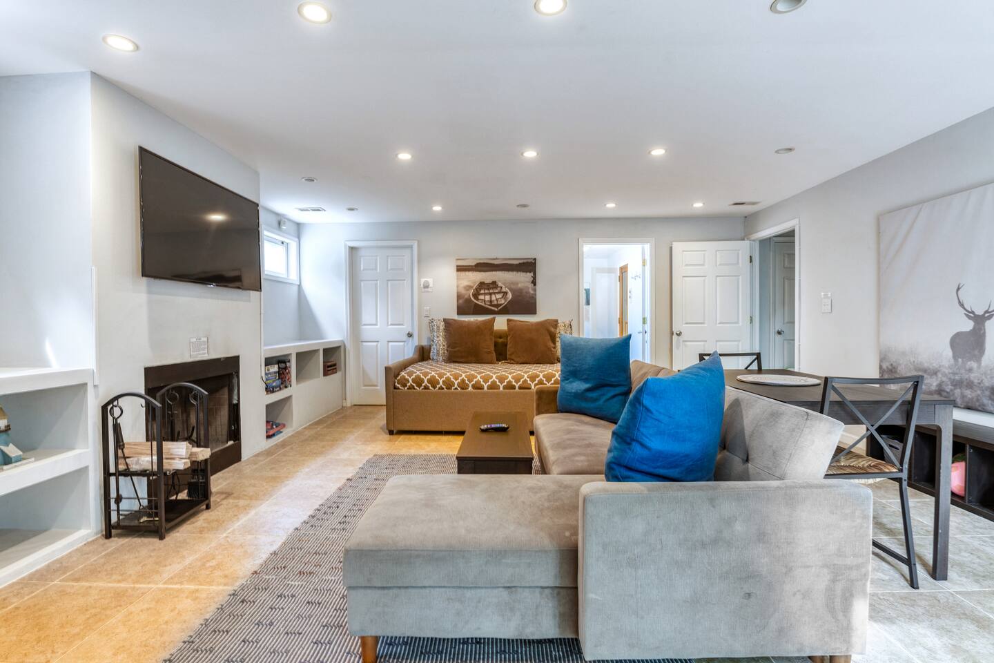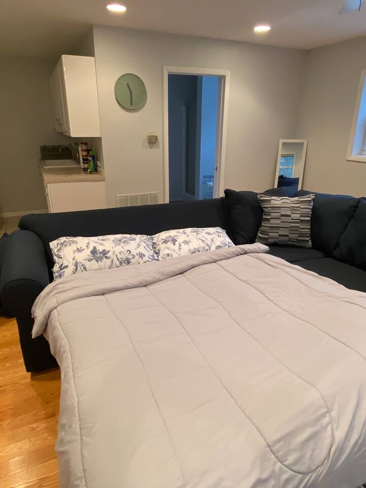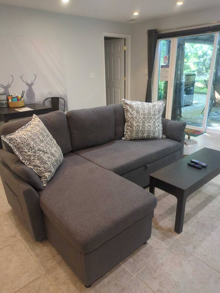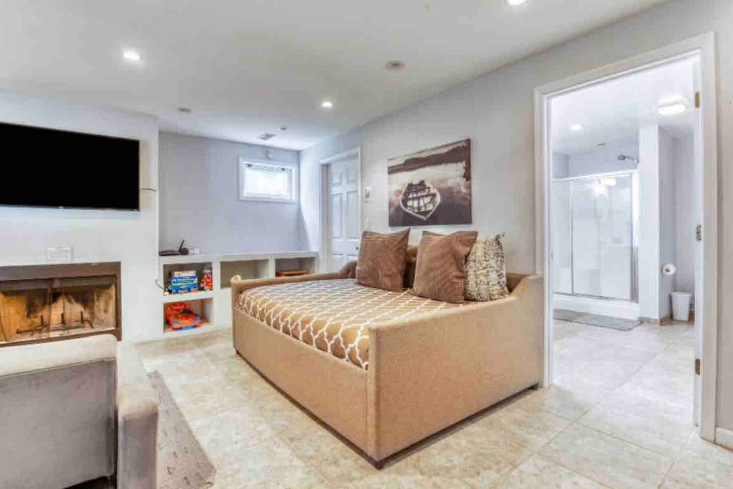 Welcome to our home! Enjoy this converted barn with two separate living and sleeping spaces with a bathroom on each level. Both areas are yours plus YEAR-ROUND outdoor hot tub and tons of other amenities! The lower bedroom suite has a full-size bed, sleeper sofa, kitchenette and a private bathroom w sauna. Upstairs bedroom features a queen bed and bunk beds. All beds boast comfy premium memory foam mattresses and all TVs are 4K smart TVs. The kitchen is modern and well-equipped for cooking meals and downstairs kitchenette is perfect for when you’re all gathered around the fireplace and still want to warm up a snack or store your beverages in a fridge. Enjoy our quiet wooded retreat just a 10 min walk to Cherry beach or ride over on our complimentary cruiser bikes! *Use at your own risk.* During the summer we have the yard professionally treated for mosquitos so you can take advantage of hot tub, patio, fire pit, and gas grill. We also offer a wide assortment of games and equipment for your enjoyment! *Please request specific items in advance of your arrival so that we can make sure they’re available for your use during your stay. We even have a large enclosed space for pets to relieve themselves! (Pets *must be approved in advance*and there is pet fee and maximum of one pet per group). Come see why Harbert has become the favorite destination in Southwest Michigan!
