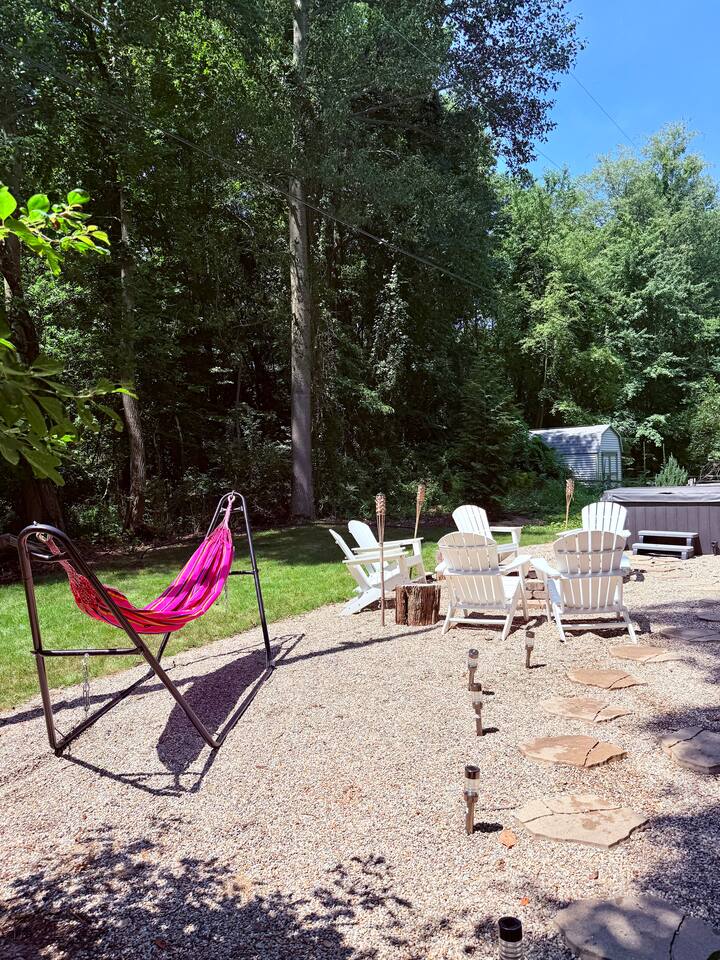 Please be aware of a few important notes: - We offer a wide range of baby and elder-care equipment rentals for families traveling with those in need of special accommodations. Baby gear includes folding cribs, high chairs, baby gates, pack & plays, excersaucers, baby tubs and a huge array of age-appropriate toys. Elder-care equipment includes rollators, walkers, portable wheel chairs, portable toilets. All are professionally cleaned & sanitized between guests - All gaming and outdoor equipment is kept offsite to prevent loss & theft. Please let us know IN ADVANCE what you would like to use and we will leave the requested equipment onsite for you. *If any items are lost or damaged, a replacement fee will be charged.* - This is a rural area so internet connection can be spotty when there are storms but we have the fastest internet available (400 mbps) and best carrier (X-finity) in the area! - This house is in the woods. Whether we like it or not, bugs happen! We have the entire property (interior & exterior and including lawn) treated for mosquitoes, ticks, and ants every 2 weeks by Orkin using pet-safe insecticides. But ants love little crumbs left by little hands and spiders love ants, so..... you get the idea. :) Please practice patience & tolerance if possible but definitely let us know about any pest issues that arise! - Storms also happen! We do experience occasional power outages due to the abundance of trees but we have a portable generator to ensure minimal disruption - The yard is not fenced and Red Arrow Highway is not THAT far away, so please keep dogs leashed at all times. Ok - Please note that there is an additional charge for guest counts exceeding 7!